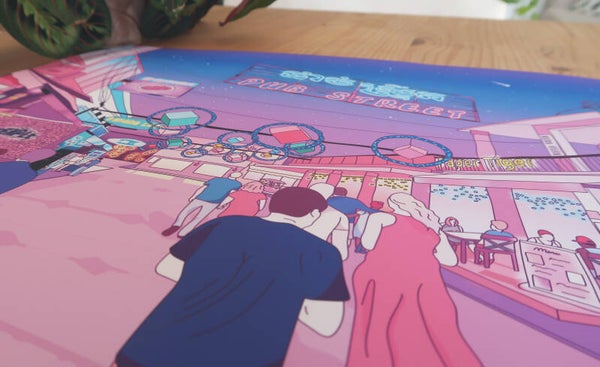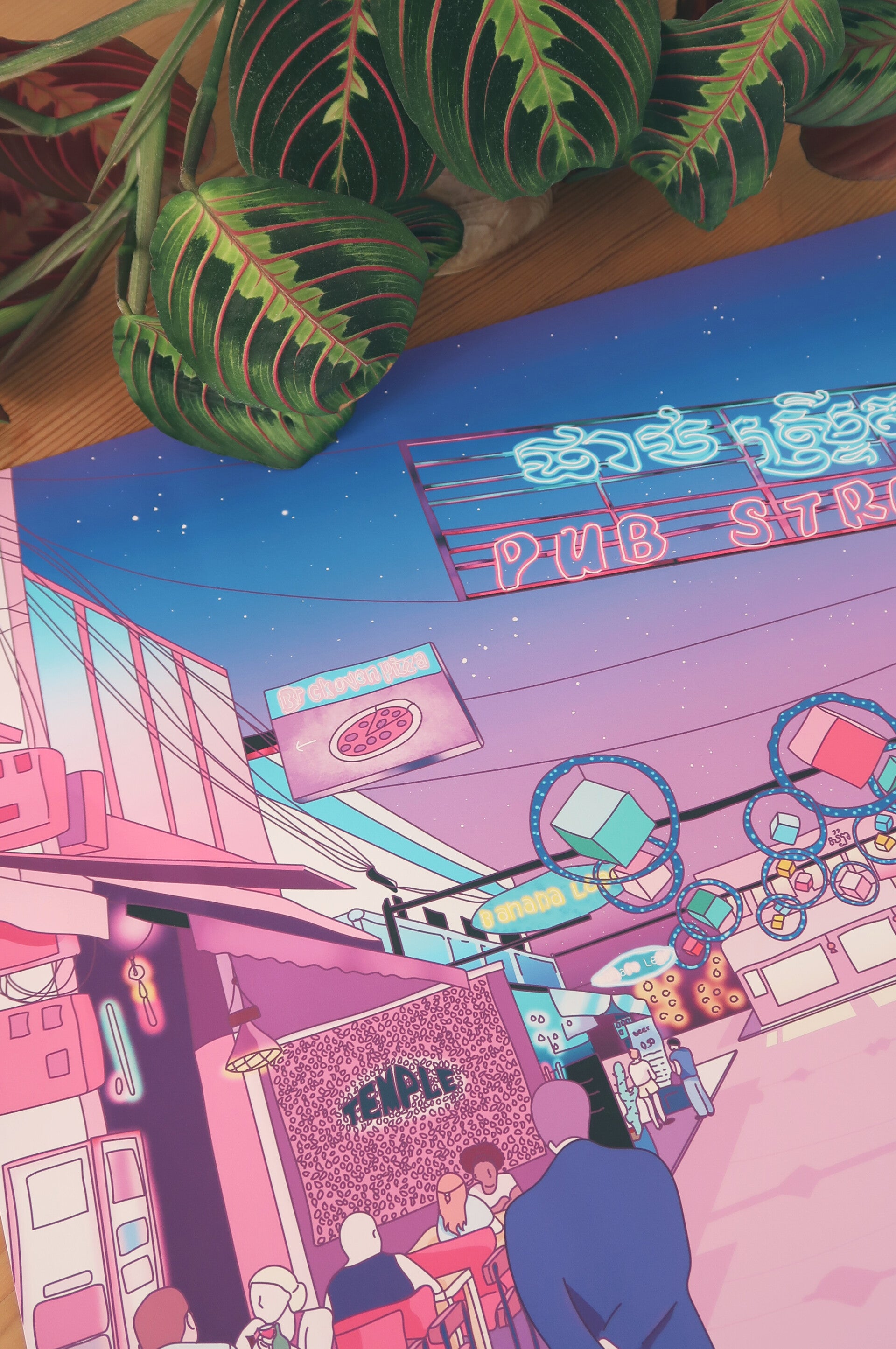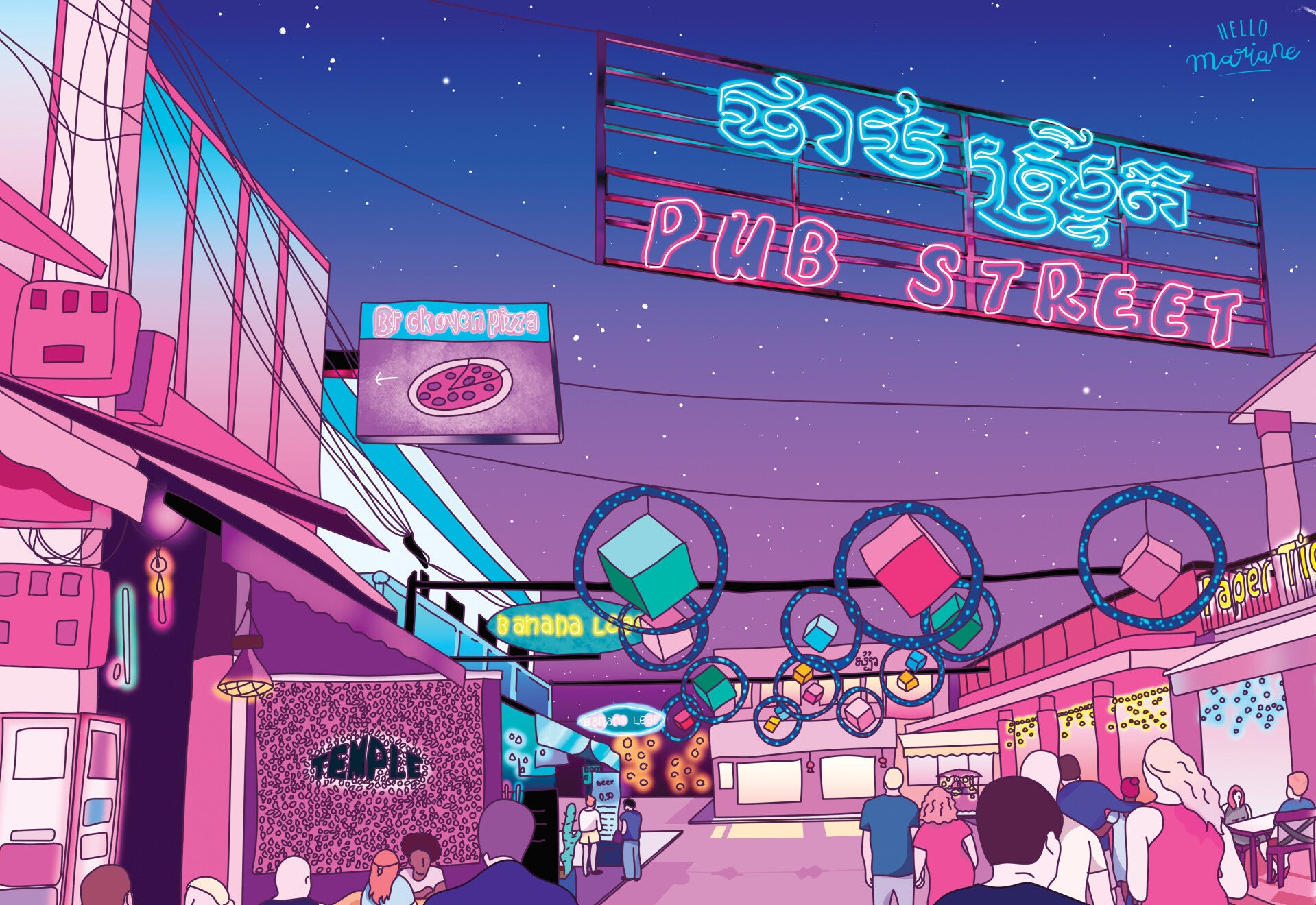 Illustration faite suite à un voyage au Cambodge. Il s'agit de la rue "Pub Street", à Siem Reap, dans une ambiance nocturne aux teintes pastel.